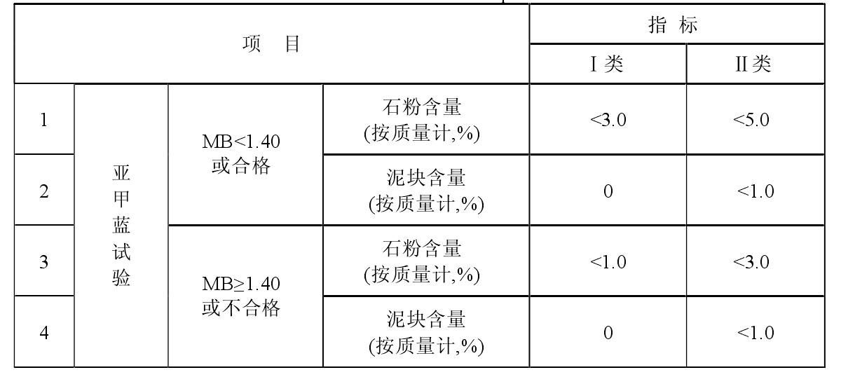 人工砂中的石粉含量和泥塊含量首先應(yīng)符合下表的規(guī)定。在一定情況下可以將Ⅱ類的石粉含量放寬到7%左右。