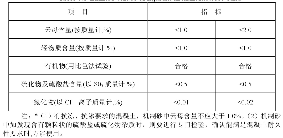 人工砂中不應(yīng)混有草根、樹葉、樹枝、塑料、煤塊、爐渣等雜物。機(jī)制砂中如含有云母、輕物質(zhì)、有機(jī)物、氯化物、硫化物及硫酸鹽等有害物質(zhì),應(yīng)符合規(guī)定。